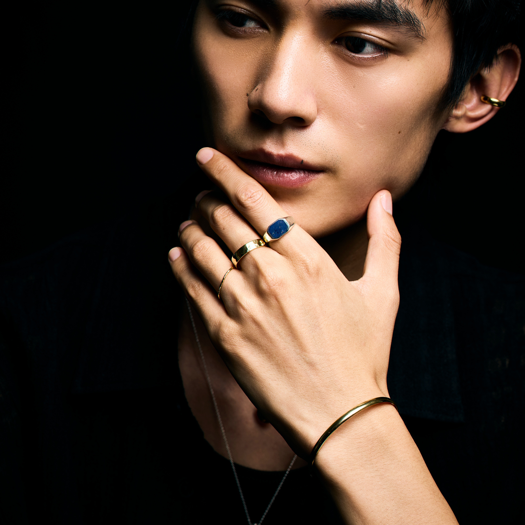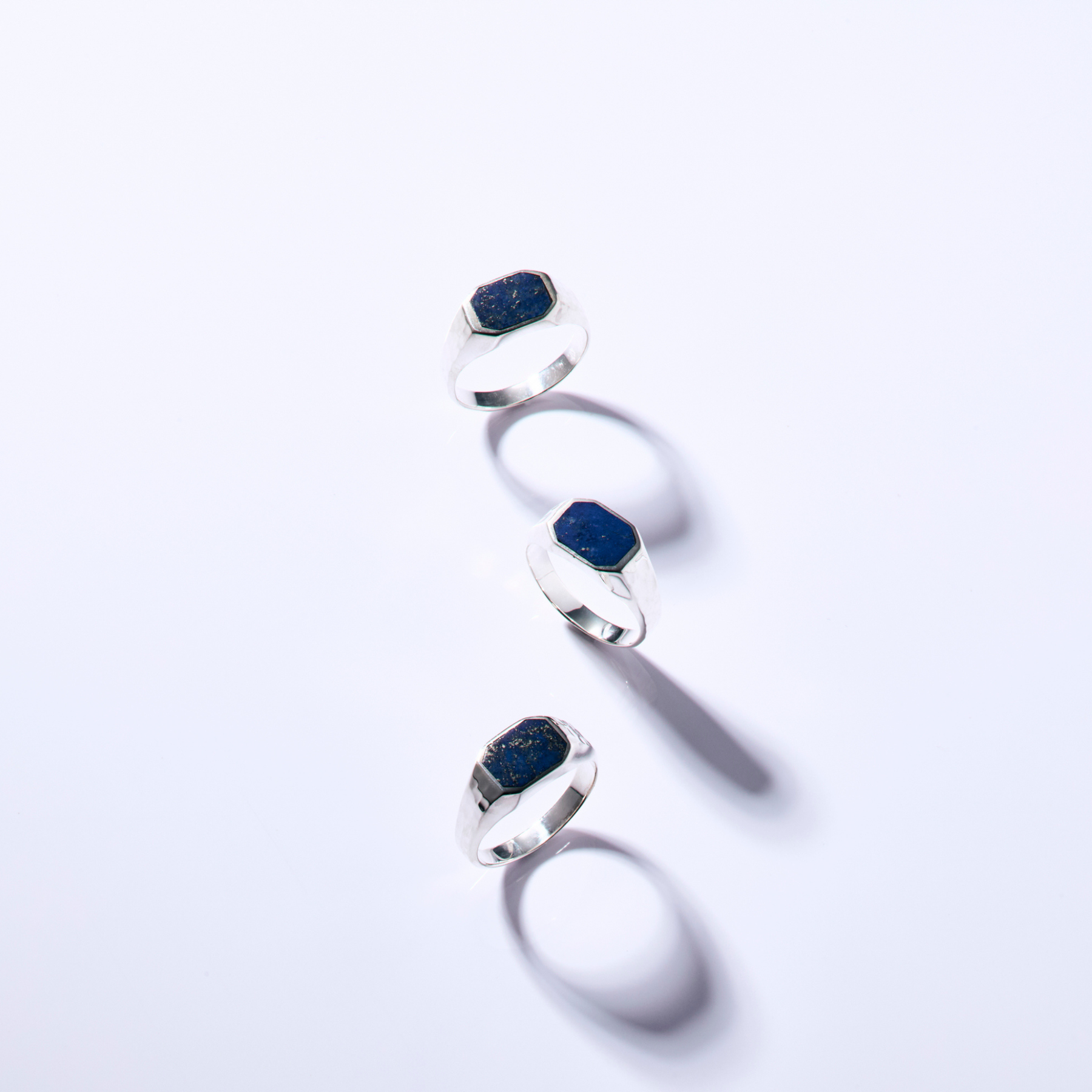 天然のラピスラズリを、一点ずつ銀の枠に留めたリングです。